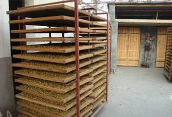 1、階段,升溫階段:將裝好菊花的托盤,平整的放入烘箱,不能重疊,避免托盤放置不好造成不必要的漏風(fēng)。關(guān)閉箱門打開熱風(fēng)爐風(fēng)機,點燃熱風(fēng)爐,開始向箱內(nèi)送熱風(fēng),逐漸將箱內(nèi)溫度加熱至50°,加熱30分鐘~1.5小時,看箱內(nèi)有濕氣時,開始排潮,大約排潮2分鐘左右,排潮后箱內(nèi)溫度會有所下降,繼續(xù)供熱。