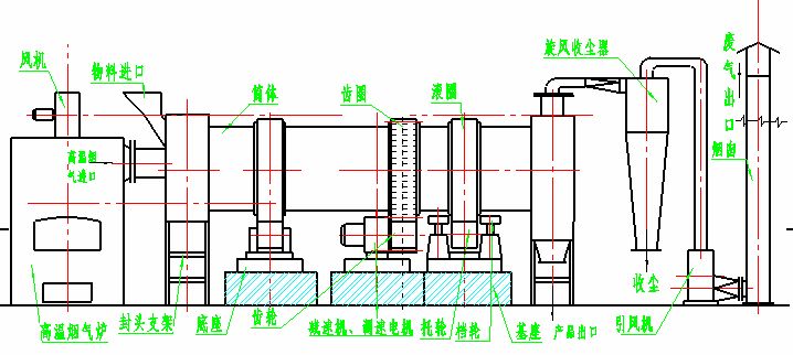 干燥的濕物料由皮帶輸送機(jī)或斗式提升機(jī)送到料斗,然后經(jīng)料斗的加料機(jī)通過(guò)加料管道進(jìn)入加料端。加料管道的斜度要大于物料的自然傾角,以便物料順利流入干燥器內(nèi)。干燥器圓筒是一個(gè)與水平線略成傾斜的旋轉(zhuǎn)圓筒。物料從較高一端加入,載熱體由低端進(jìn)入,與物料成逆流接觸,也有載熱體和物料一起并流進(jìn)入筒體的。隨著圓筒的轉(zhuǎn)動(dòng)物料受重力作用運(yùn)行到較底的一端。濕物料在筒體內(nèi)向前移動(dòng)過(guò)程中,直接或間接了載熱體的給熱,使?jié)裎锪系靡愿稍?,然后在出料端?jīng)皮帶機(jī)或螺旋輸送機(jī)送出。在筒體內(nèi)壁上裝有抄板,它的作用是把物料抄起來(lái)又撒下,使物料與氣流的接觸表面增大,以提高干燥速率并促進(jìn)物料前進(jìn)。載熱體一般分為熱空氣、煙道氣等。載熱體經(jīng)干燥器以后,一般需要旋風(fēng)除塵器將氣體內(nèi)所帶物料捕集下來(lái)。如需進(jìn)一步減少尾氣含塵量,還應(yīng)經(jīng)過(guò)袋式除塵器或濕法除塵器后再放排放。